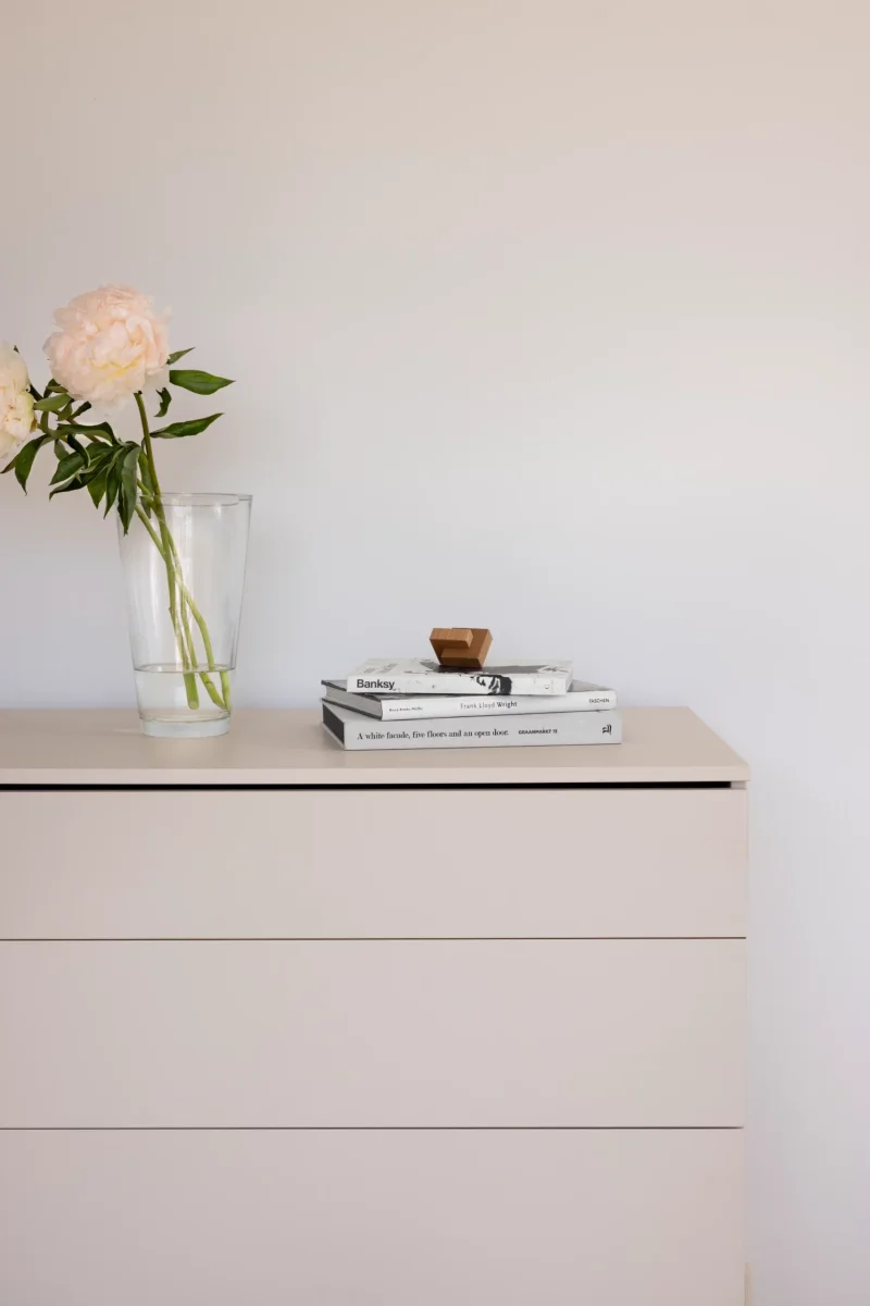 De commode is voorzien van drie greeploze laden met push-to-open systeem.