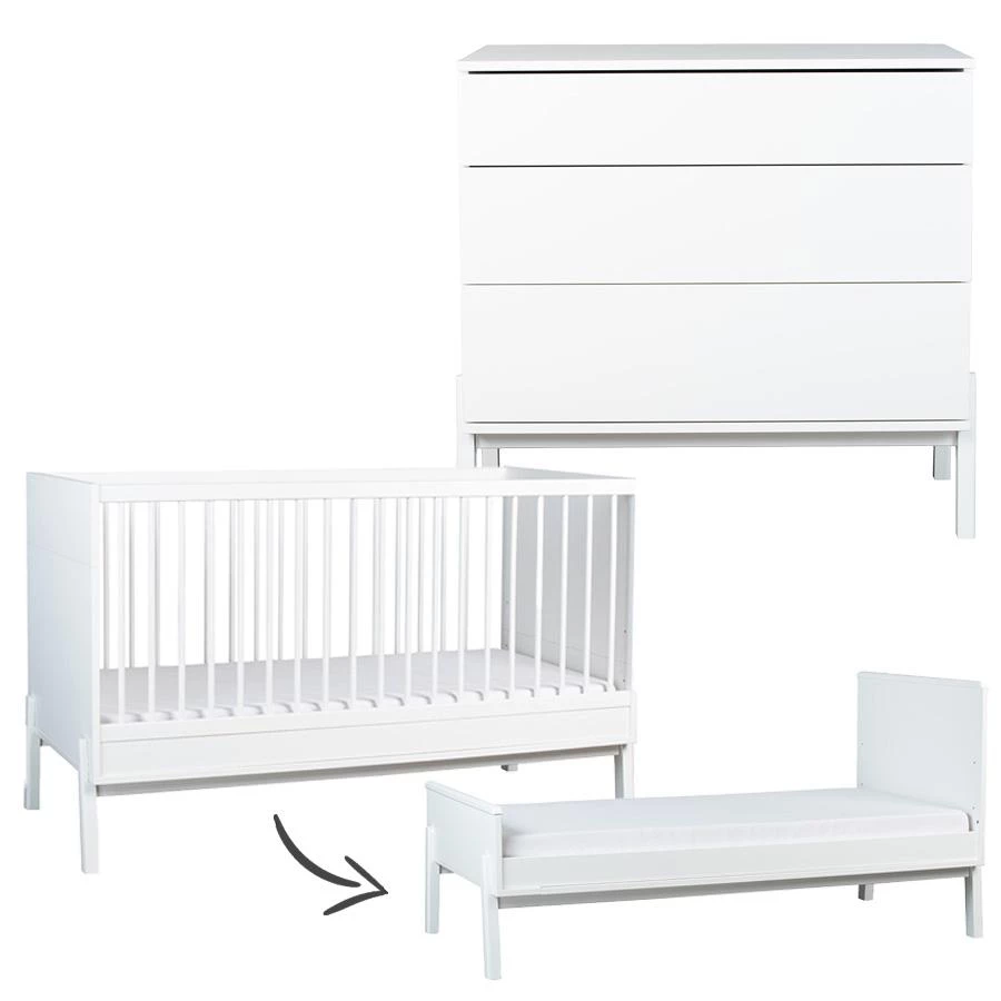 De prachtige Quax Ashi 2-delige meegroeikamer in de kleur Cream bestaat uit een bed van 70×140 en een commode. Beidegemaakt uit een mix van massief beuken en melamine.