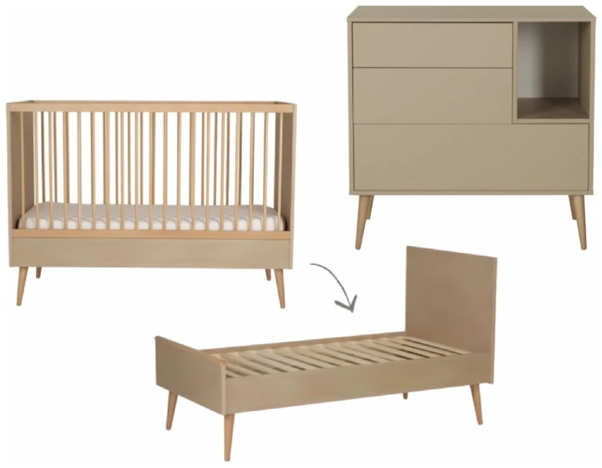 De Quax Cocoon 2-delige meegroeikamer in de kleur latte is een aanwinst en elk huishouden. De set bestaat uit een ledikant (70×140) en een commode. Zo kan je baby slapen, kun je verschonen en heb je genoeg opbergruimte. Het ledikant is later om te bouwen naar een peuterbedje. Mocht je meer ruimte nodig hebben kun je ook de 3-delige set gaan. Hier zit nog een kledingkast bij. In de Cocoon collectie van Quax is ook een bladvergroter beschikbaar zodat je meer ruimte hebt tijdens het verschonen en je baby recht voor je ligt. Dit maakt het een stuk gemakkelijker. Deze is los bij te bestellen net als een passend matrasje. Voor de commode zijn nissen beschikbaar in verschillende kleuren zodat je er je eigen twist aan kunt geven.