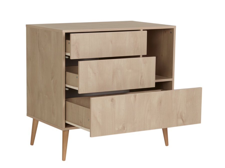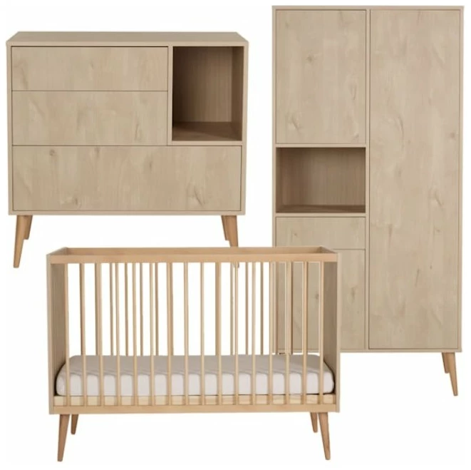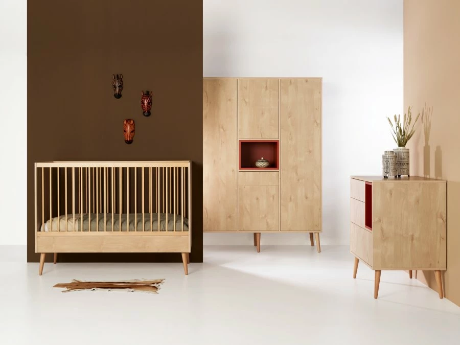 De Quax Cocoon 3-delige babykamer in de kleur natural oak is een aanwinst en elk huishouden. De set bestaat uit een ledikant (60×120), kledingkast en een commode. Zo kan je baby slapen, kun je verschonen en heb je genoeg opbergruimte. In de Cocoon collectie van Quax is ook een bladvergroter beschikbaar zodat je meer ruimte hebt tijdens het verschonen en je baby recht voor je ligt. Dit maakt het een stuk gemakkelijker. Deze is los bij te bestellen net als een passend matrasje. Voor zowel de kledingkast als de commode zijn nissen beschikbaar in verschillende kleuren zodat je er je eigen twist aan kunt geven.