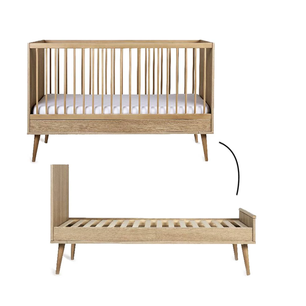 De Quax Flow 2-delige meegroeikamer in de kleur Honey Ash heeft een prachtige uitstraling. De egale lak combineert met hout fineer staat zeer luxe. De set bestaat uit een doorbouw bedje(70×140) en een commode. Zo kan je baby slapen, kun je verschonen en heb je genoeg opbergruimte. Het ledikant is later om te bouwen tot peuterbedje. Mocht je meer ruimte nodig hebben kun je ook de 3-delige set gaan. Hier zit nog een kledingkast bij. In de Flow collectie van Quax is ook een bladvergroter beschikbaar zodat je meer ruimte hebt tijdens het verschonen en je baby recht voor je ligt. Dit maakt het een stuk gemakkelijker. Deze is los bij te bestellen net als een passend matrasje.