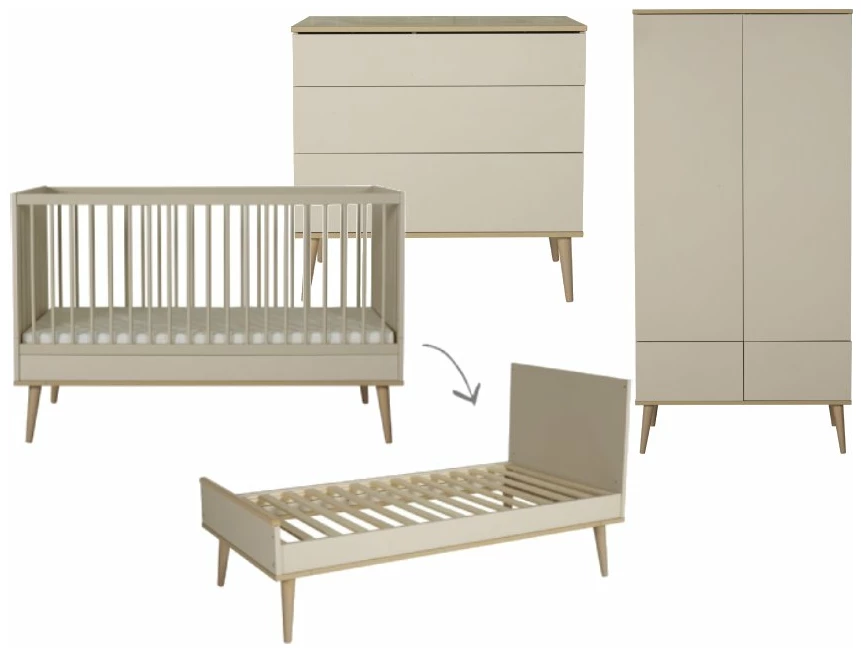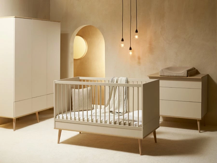De Quax Flow 3-delige meegroeikamer in de kleur clay & oak heeft een prachtige uitstraling. De egale lak combineert met hout fineer staat zeer luxe. De set bestaat uit een doorbouw bedje(70×140) , commode en kledingkast. Zo kan je baby slapen, kun je verschonen en heb je meer dan genoeg opbergruimte. Het ledikant is later om te bouwen tot peuterbedje. Wil je nog meer opbergruimte? Dan kun je ook de 2-delige kamer samen met de XL flow kledingkast bestellen. In de Flow collectie van Quax is ook een bladvergroter beschikbaar zodat je meer ruimte hebt tijdens het verschonen en je baby recht voor je ligt. Dit maakt het een stuk gemakkelijker. Deze is los bij te bestellen net als een passend matrasje.