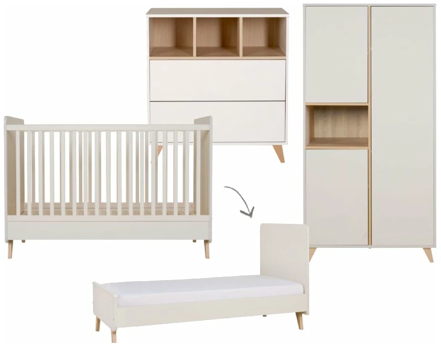 De Quax Loft 3-delige meegroeikamer in de kleur clay bestaat uit een ledikant (70×140), kledingkast en een commode. Zo kan je baby slapen, kun je verschonen en heb je meer dan genoeg opbergruimte. In de Loft collectie van Quax is ook een bladvergroter beschikbaar zodat je meer ruimte hebt tijdens het verschonen en je baby recht voor je ligt. Dit maakt het een stuk gemakkelijker. Deze is los bij te bestellen net als een passend matrasje.