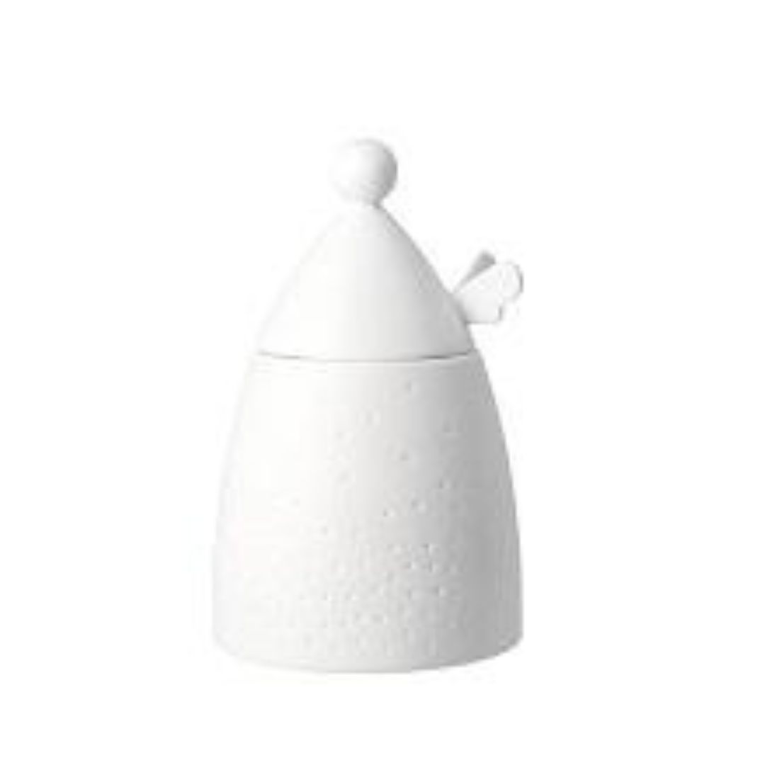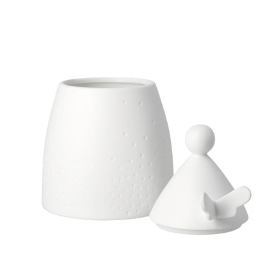 Prachtige van wit mat porselein engel doosje. Het deksel is een mooie witte engel met vleugels, het bakje heeft mooie witte puntjes. Prachtig op tafel voor ontbijt, diner, leuk te combineren met alle andere mooie objecten van Räder.