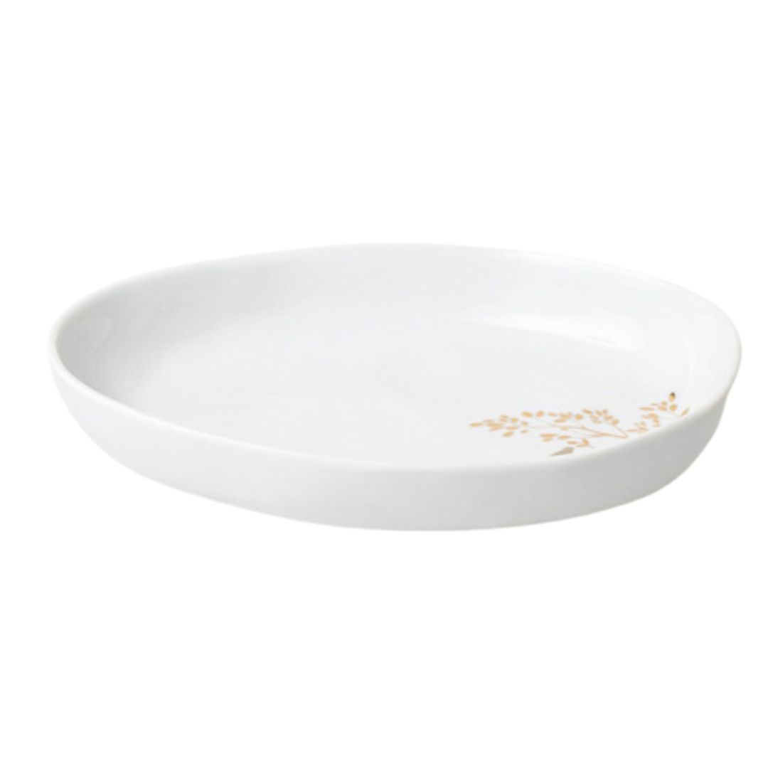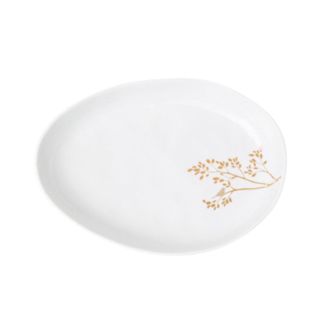 Prachtig ovaal bakje of bowl van Räder, de golden bird branch. Het bakje is licht ovaal, mooie opstaande rand met in het bakje een afbeelding van een goudkleurig takje met een zilver kleurig vogeltje. De binnenzijde is geglazuurd, super praktisch, de buitenzijde is mat afgewerkt.
