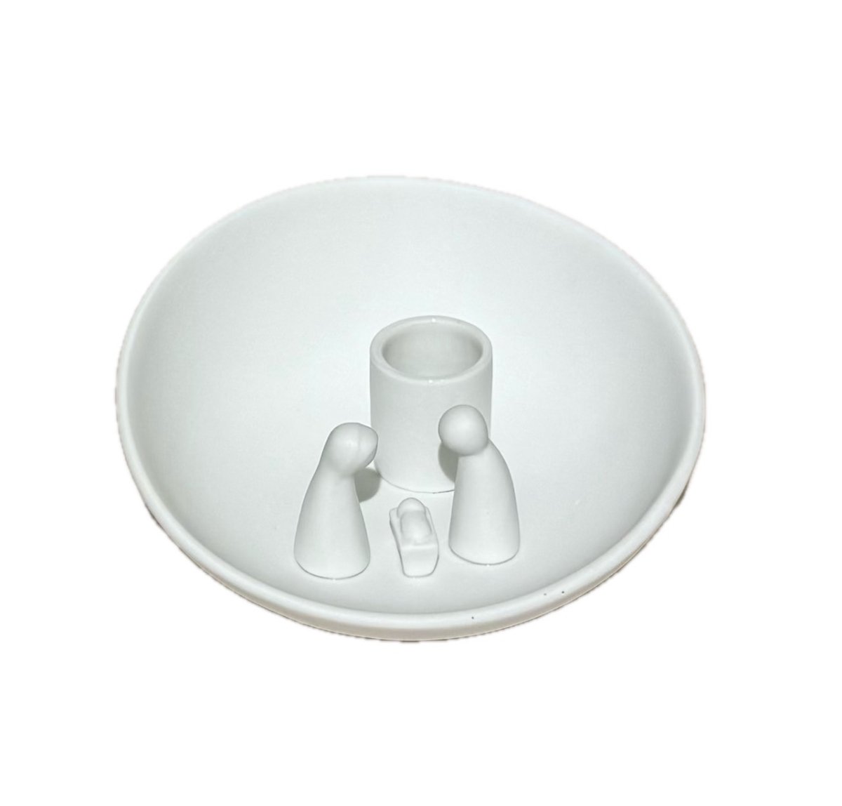 Mooi mat witte schuin afgesneden schaaltje van Räder. Met een kleine kribbe en kaarsenhouder. Erg fraai en lieflijk ter decoratie in je huis rondom kerst. In de buitenzijde van het schoteltje zijn nog sterretjes afgedrukt. Leuk om cadeau te geven of om te krijgen.