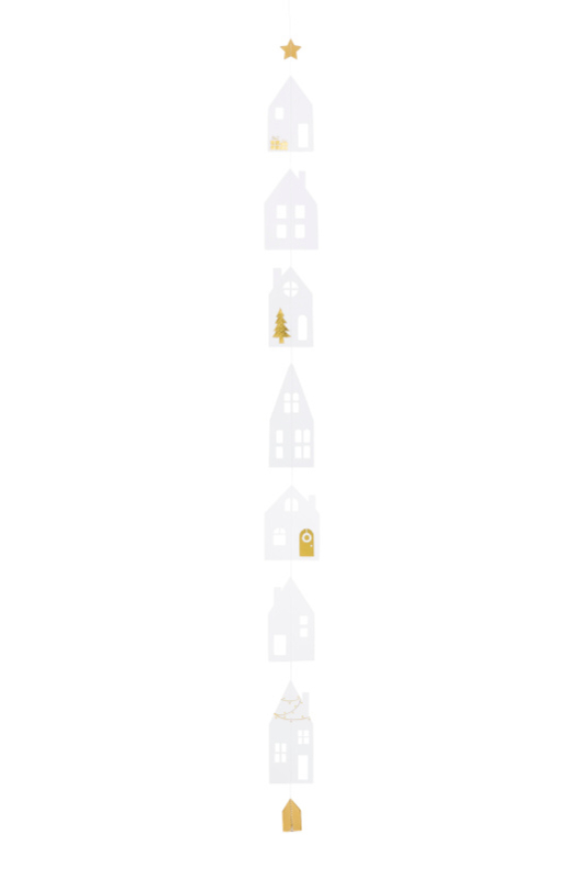 Prachtige papieren ketting met huisjes. Het onderste huisje heeft een gouden kleur en anderen hebben gouden details. De ketting heeft aan de bovenkant een gouden ster. Ook prachtig om je slaapkamer of kinderkamer mee aan te kleden
