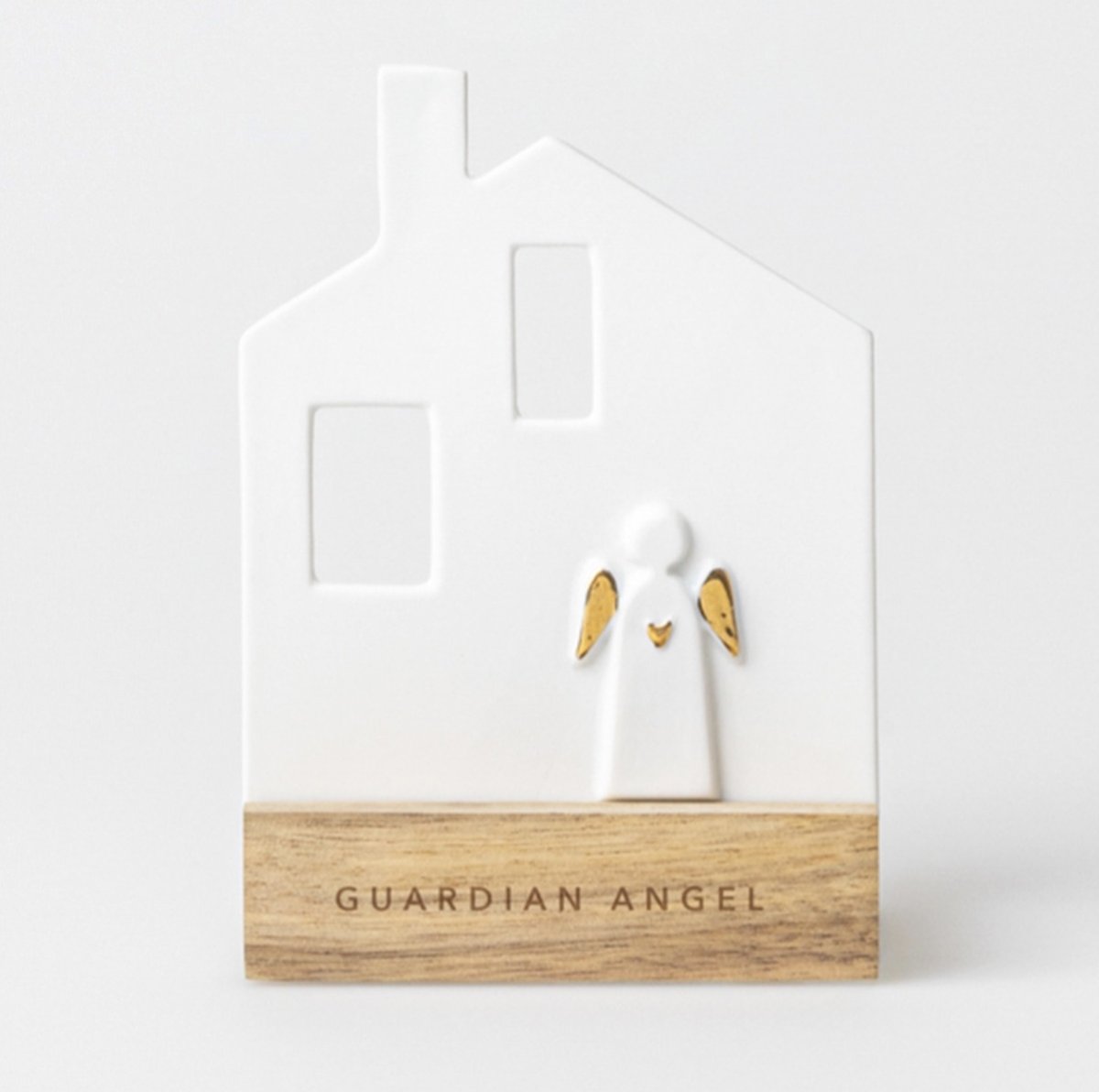 Een houten voetje met een porseleinen huisje (plat) en beschermengel. Op het voetje achter het huisje is er ruimte om het waxinelichtje te plaatsen. Als het lichtje brandt schijnt het huisje mooi door. Een leuke decoratie in je huis.