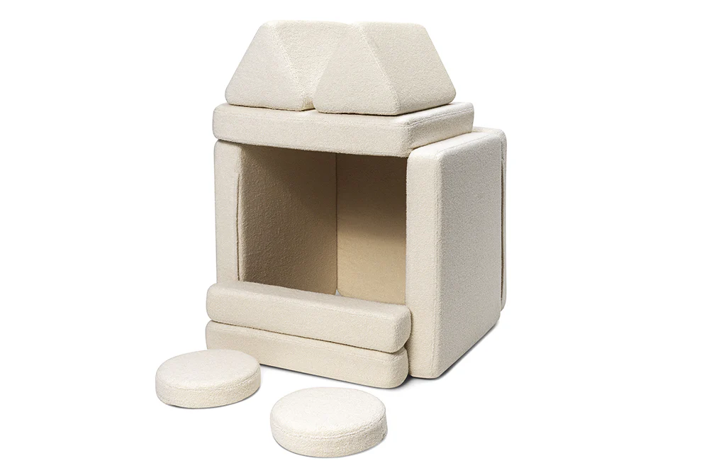 De Shappy speelbank bestaat uit acht onderdelen: vier zitkussens (elk in paren aan elkaar genaaid), twee driehoekige rugleuningen, twee armleuningen en twee ronde kussens. Deze opstelling biedt een comfortabele en ondersteunende structuur voor je kind om op te spelen.
