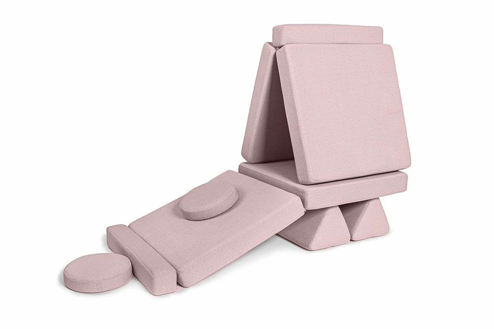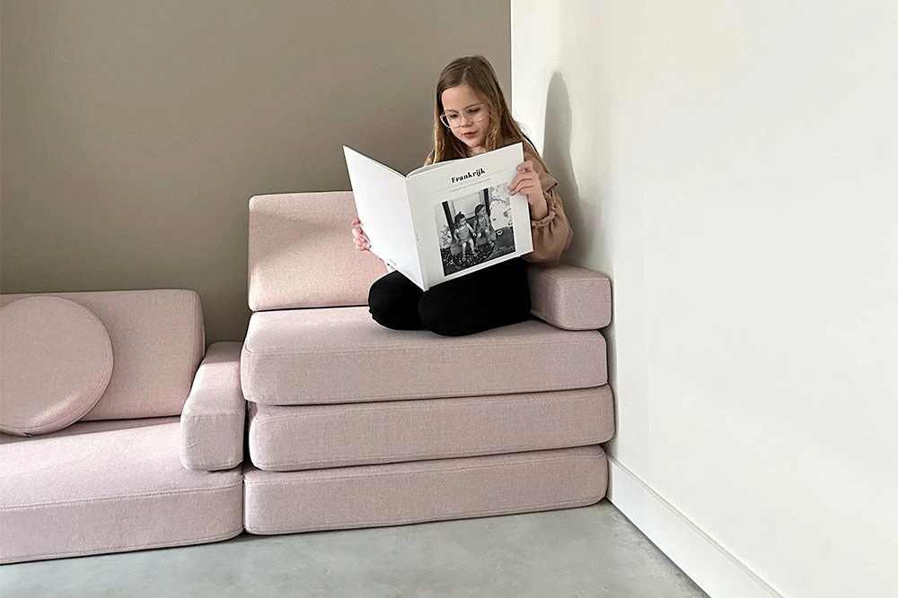 De Shappy Speelbank in de kleur Soft Pink, gemaakt van zachte Plush-stof, bestaat uit acht onderdelen. Deze set omvat vier zitkussens (gepaard per twee), twee driehoekige rugleuningen, twee armsteunen en twee ronde kussens. Dit ontwerp biedt je kind een stevige en comfortabele basis om mee te spelen en te ontspannen.