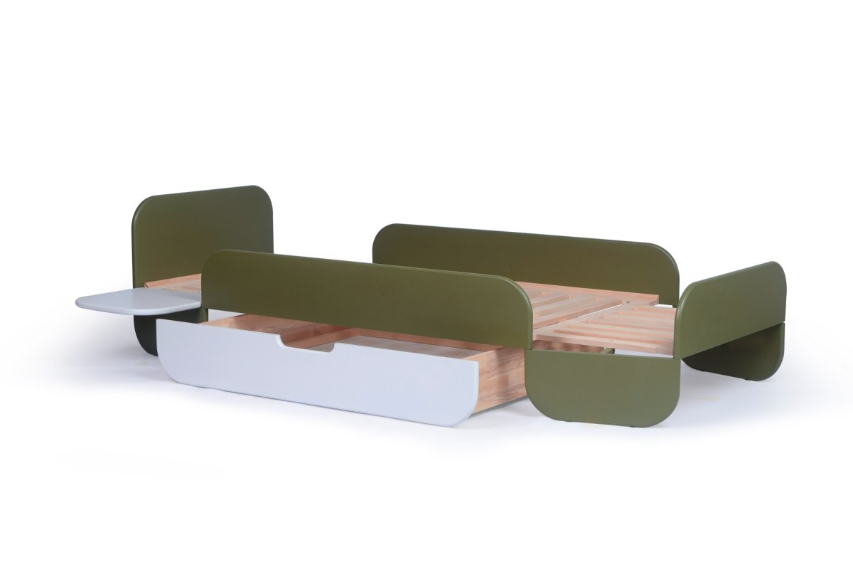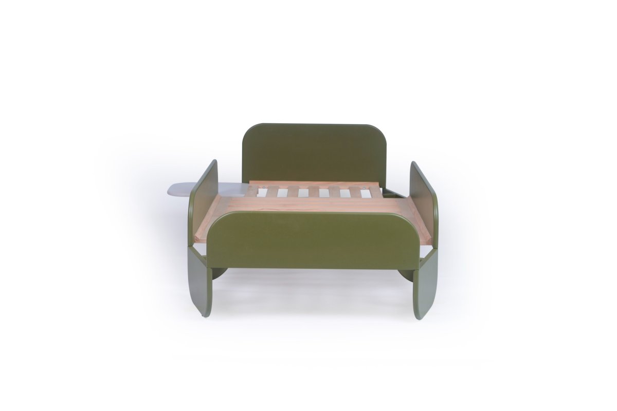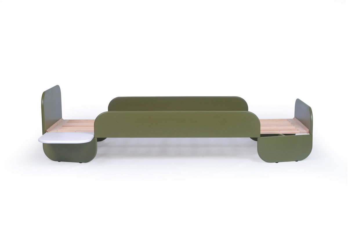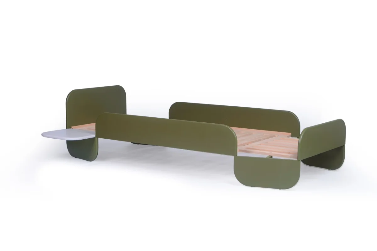 Haal een vleugje natuur in huis met het Pinno-bed van Stribbo! Dit stijlvolle en functionele ontwerp, gecreëerd door Neisako Studio, combineert zachte, organische lijnen met de warme uitstraling van olijf groen.