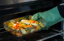 De siliconen ovenwant is heel geschikt om hete schalen en bakblikken uit de oven te halen. Het materiaal is heel hitte bestendig en van nature anti-slip waardoor je ook nog extra veel grip hebt bij het vastpakken van een schaal of bakblik. De ovenwant is gevoerd met textiel waardoor het extra dik en hittebestendig is. Door de siliconen buitenkant is deze ovenwant veel geschikter voor hete schalen dan een traditionele textielen ovenwant.