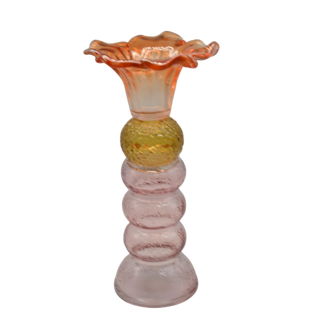 Vrolijk gote glazen kandelaar in de vorm van een exotische bloem. Aan de ene kant kun je hem als kandelaar gebruiken met een kaars, draai je hem om kun je er bloemen in zetten. Mooie kleurcombinatie van zacht roze, geel en oranje gekleurd glas.
