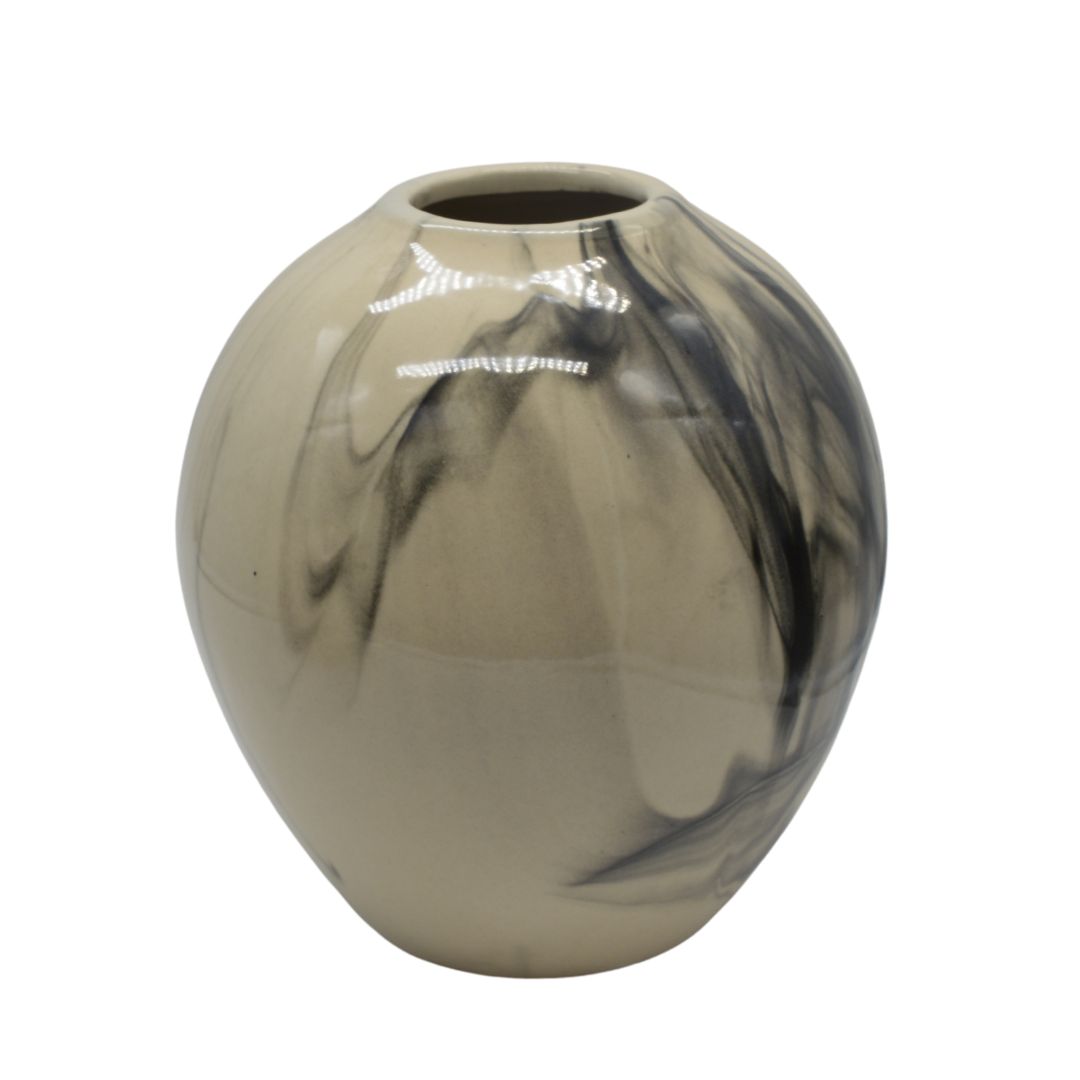 Prachtig Deens keramiek, van Broste Copenhagen. Een ecru kleurige vaas met een gemarmerde zwart antraciet kleurig print. Dit model heeft een bolle buik en loopt naar boven smal toe voor de opening. Geheel geglazuurd aan buiten en binnenzijde, dus zeer geschikt voor een bosje bloemen