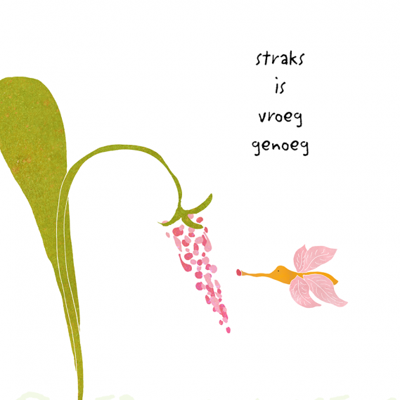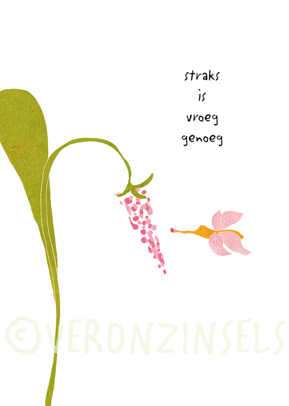 Stevige kaart van viltjes karton, met verrassende tekst en illustratie van Veronzinsels, De kaart kan door het uitdrukbare voetje zelf staan. Kaart wordt geleverd met gekleurde bedrukte envelop.