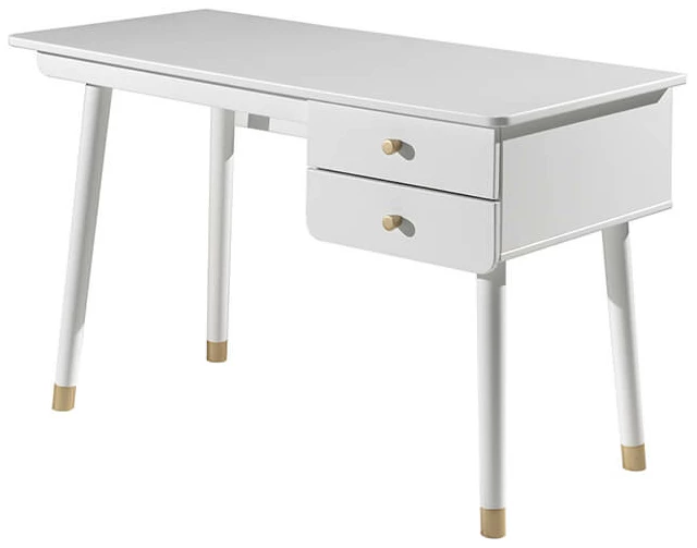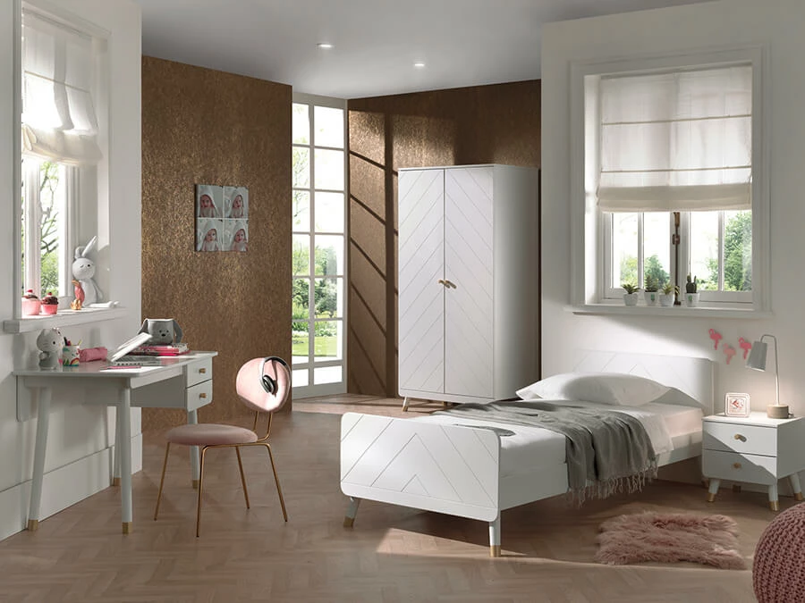 Het Vipack Billy bureau in het wit zorgt voor de finishing touch in elke tienerkamer. Het bureau heeft twee handige lades om spulletjes in op te bergen. Het blad is 75 cm hoog. De diagonale strepen zijn kermerkend voor deze collectie. Dit geldt ook voor de gouden handgreepjes en pootjes. Deze tafel is prima te combineren met andere kleuren uit de Billy collectie.