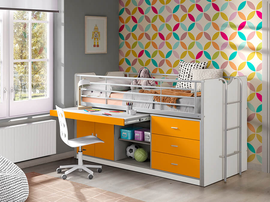 Ieder kind zal associaties hebben met de kleur oranje: zijn of haar grote sportheld in het shirt van het Nederlands team bijvoorbeeld, of de ondergaande zon en die mooie vissen in het aquarium. Allemaal fijne, positieve associaties, dus waarom niet wat meer oranje in de kinderkamer? Deze oranje Vipack BONNY halfhoogslaper tovert een en al vrolijkheid tevoorschijn op de kinderkamer. En niet alleen de kleur is reden voor vrolijkheid, ook de praktische eigenschappen zullen u en uw kind vrolijk stemmen. Deze BONNY halfhoogslaper wordt namelijk niet voor niets compact genoemd. Onder het kinderbed zitten een bureau, een kastje met deurtjes, legplanken en een ladekastje met drie lades verwerkt. Waar in veel kinderkamers de ruimte onder het kinderbed nauwelijks wordt benut, wordt nu het maximale eruit gehaald. Het is niet alleen handig dat alle spullen nu lekker bij de hand zijn, er blijft ook gewoon meer ruimte over op de kinderkamer voor andere leuke dingen. Geef de creativiteit van u en uw kleine alle ruimte en bedenk welke nieuwe mogelijkheden dit allemaal biedt voor de inrichting van de kinderkamer!