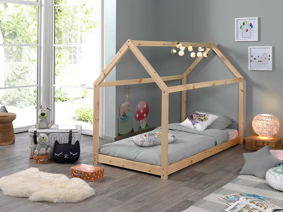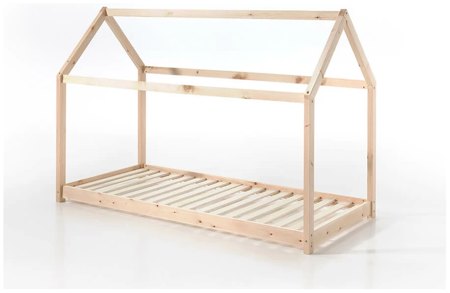 CABANE bed 90x200cm naturel. Dit bed is vervaardigd uit massief grenen en de lattenbodem is inclusief. Deze ligt 8cm boven de vloer, waardoor de matras steeds de nodige verluchting heeft.