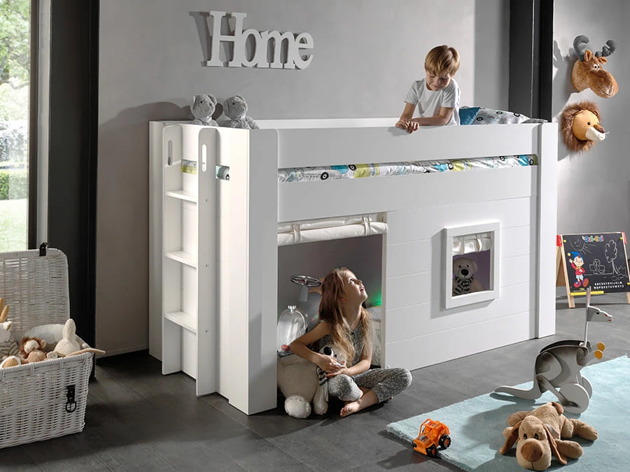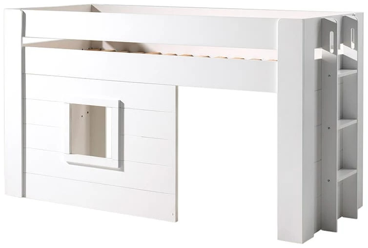De Noah halfhoogslaper van 90X200Cm is vervaardigd uit wit gelakt MDF en komt standaard met lattenbodem. Het slaapgedeelte is volledig omrand. Het onderste gedeelte lijkt dan perfect op een huis, waardoor je kind uren kan spelen onder zijn of haar bed. Om dit speelhuisje nog huiselijker te maken is er ook een gordijnsetje beschikbaar voor het raam en de deur. De trap zit aan de kopse kant en er kan gekozen worden aan welke kant deze geplaatst wordt.