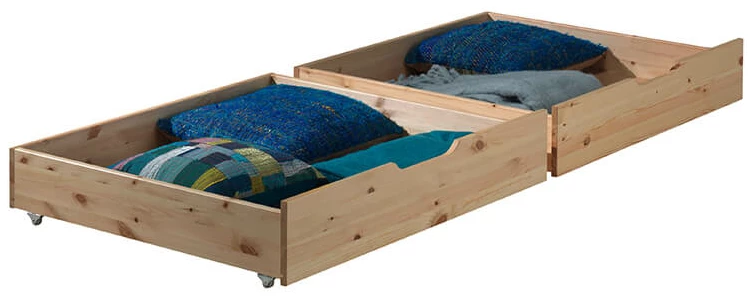 Het is handig om de ruimte op de kinderkamer zo goed mogelijk te benutten. Deze Vipack PINO lades voor onder het kinderbed kunnen daarbij helpen. Deze twee lades passen onder elk PINO kinderbed. Op de afbeeldingen zijn de lades gecombineerd met de verschillende PINO stapelbedden. De twee PINO lades zijn voorzien van wieltjes, uw kind rolt ze dus zo onder zijn of haar kinderbed vandaan. Handig om spullen in op te bergen die regelmatig bij de hand moeten zijn, bijvoorbeeld het beddengoed. Dichterbij het bed opbergen kan bijna niet! Omdat de lades in dezelfde kleur zijn afgewerkt als het kinderbed – u kunt natuurlijk ook bewust voor een andere kleur kiezen – zijn de lades totaal geen storend element in de kinderkamer. De massief grenen lades vullen juist mooi de lege ruimte onder het kinderbed op!