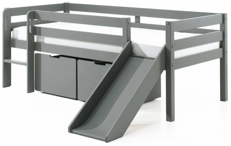 Deze Vipack Pino lage halfhoogslaper in de kleur met glijbaan grijs is iets lager dan de gewone. Hierdoor ervaart je kleine toch het genot van hoog slapen maar hoeft hij of zij niet zo hoog te klimmen. Daarbij komt het voordeel dat het iets veiliger is. Dit product is een set waardoor je de lades onder het bed ook bij krijgt? Wil je deze lades niet? Dan kun je ook enkel de halfhoogslaper bestellen. De middelhoogslaper is gemaakt van massief Scandinavisch grenenhout en is afgewerkt met milieuvriendelijke lak. Hierdoor zul je er een lange tijd plezier van hebben. De lattenbodem is inbegrepen. Een matras en beddengoed kun je gemakkelijk mee bestellen.