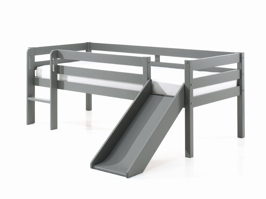 Deze Vipack Pino lage halfhoogslaper met glijbaan in de kleur grijs is iets lager dan de gewone. Hierdoor ervaart je kleine toch het genot van hoog slapen maar hoeft hij of zij niet zo hoog te klimmen. Daarbij komt het voordeel dat het iets veiliger is. Voor dit bed is een lade set beschikbaar zodat je de ruimte onder het bed optimaal kunt gebruiken. Deze set is los mee te bestellen net als een matras en beddengoed. De ruimte onder het bed is ca. 41 cm. De middelhoogslaper is gemaakt van massief Scandinavisch grenenhout en is afgewerkt met milieuvriendelijke lak. Hierdoor zul je er een lange tijd plezier van hebben. De lattenbodem is inbegrepen.