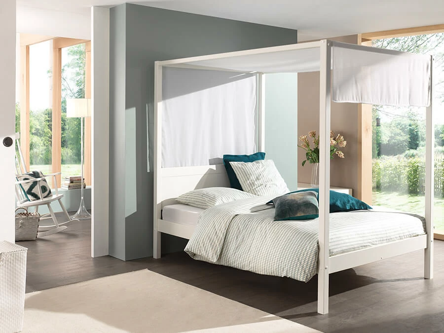 Het vipack PINO hemelbed is eveneens vervaardigd uit scandinavisch grenen hout, wit gelakt. De lattenbodem is inclusief en dit bed is voor een matras van 140x200cm. Optioneel kan er ook een textielset bij dit bed gekozen worden.