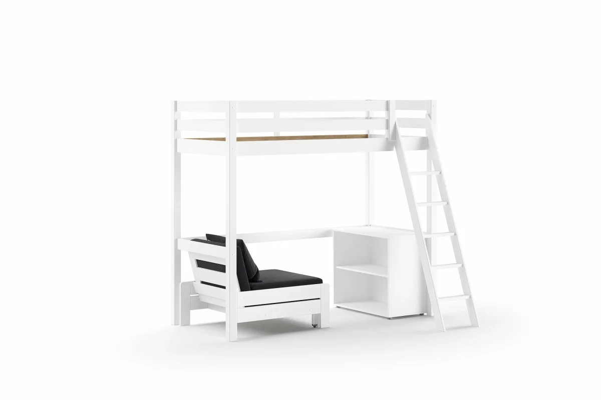 Deze PINO combinatie bestaat uit de witte PINO hoogslaper 90 x 200 cm, bijhorende boekenkast en zetelbed. De hoogslaper is vervaardigd uit wit gelakt massief grenen. Deze opstelling is de ultieme combinatie van functionaliteit, stijl en ruimtebesparing. Voor de liefhebbers van gaming biedt deze opstelling de perfecte place-to-be. Door het verhoogde slaapgedeelte wordt er een gezellige gaming corner gecreëerd. De boekenkast kan gebruikt worden als opbergkastje maar biedt net zo goed ruimte voor gamingconsoles en een tv. Het zetelbed vormt niet alleen een leuke zitplek maar is ook omvormbaar naar een extra slaapplek voor een gast.