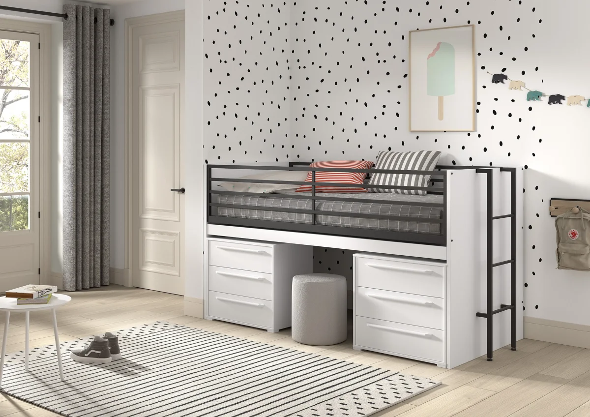 Deze Vipack Sam halfhoogslaper in het wit heeft in combinatie met de zwarte metalen accenten een eigentijdse uitstraling. Het bed is een slimme en stijlvolle optie voor wie op zoek is naar ruimtebesparende slaapmogelijkheden. Het bed is ontworpen met oog voor detail en functionaliteit. Het uitschuifbare bureau heeft een heel ruim oppervlak waardoor het perfect is voor het maken van huiswerk of andere creatieve bezigheden. Het bed beschikt over een uitvalbeveiliging en een stevige ladder die zowel links als rechts bevestigd kan worden. De ruimte onder het bureau wordt benut als extra bergruimte door de twee ladekasten. Beide ladekasten hebben drie ruime lades waardoor je zeer veel spullen uit het zicht kunt opbergen. De lades zijn voorzien van soft-close.