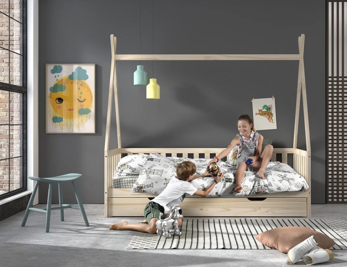 Deze set bevat de naturel Vipack Tipi MH bedbank met bedlade. Bij het bed is een lattenbodem inbegrepen maar geen matras. Deze kun je gemakkelijk mee bestellen, evenals beddengoed.