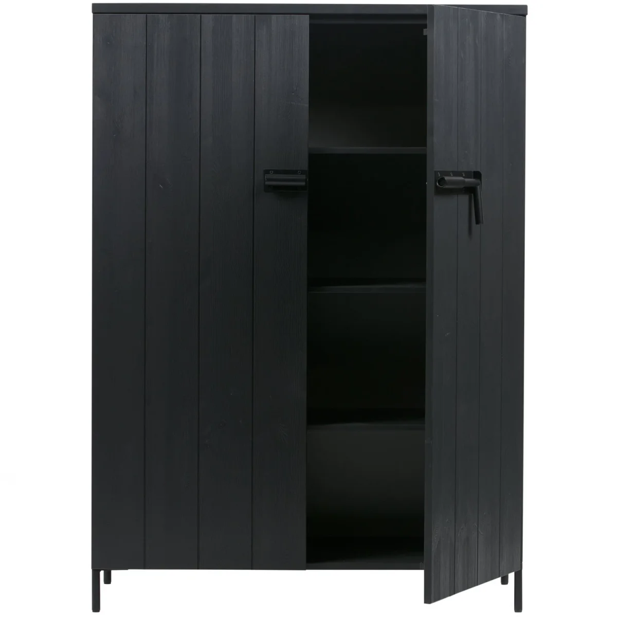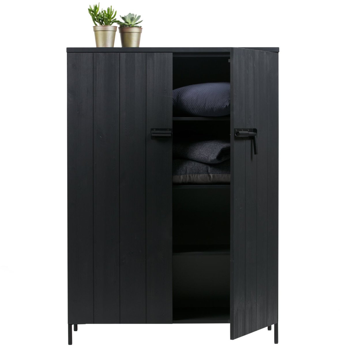 De Bruut 2-deurs kast uit de WOOOD collectie is een stoere opbergkast die een krachtige uitstraling heeft en een geweldige toevoeging is voor elke ruimte. Gemaakt van grenenhout met een geborstelde afwerking, heeft deze kast een robuuste en industriële uitstraling. De pootjes en de opvallende sluiting zijn van metaal, wat de kast een stoere afwerking geeft. Zowel het grenenhout als het metaal zijn afgewerkt in zwart, wat bijdraagt aan de moderne en strakke look van dit meubel.