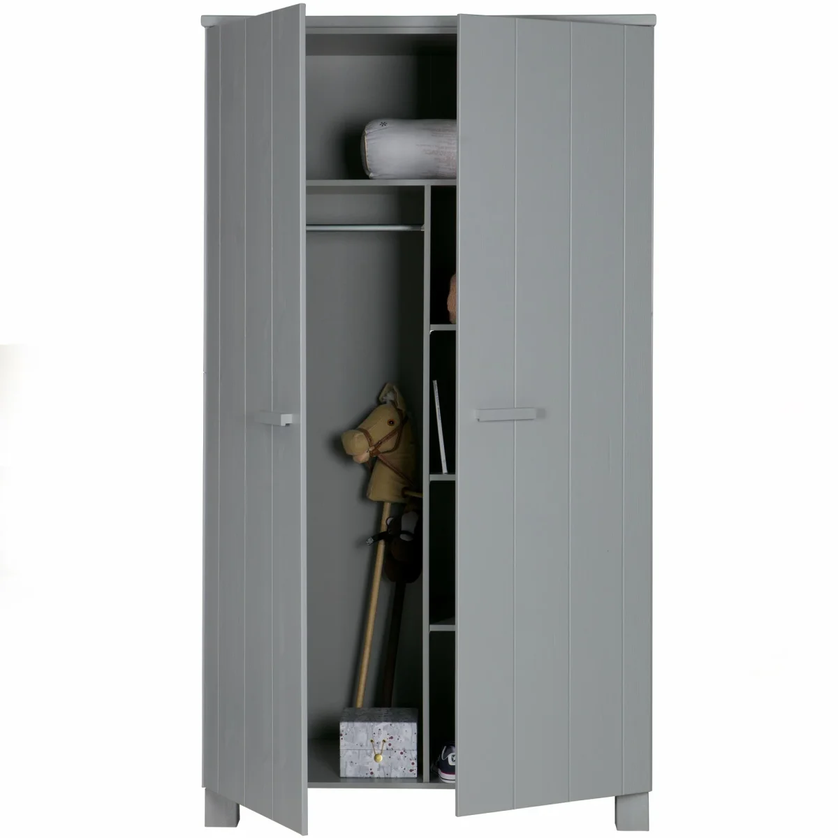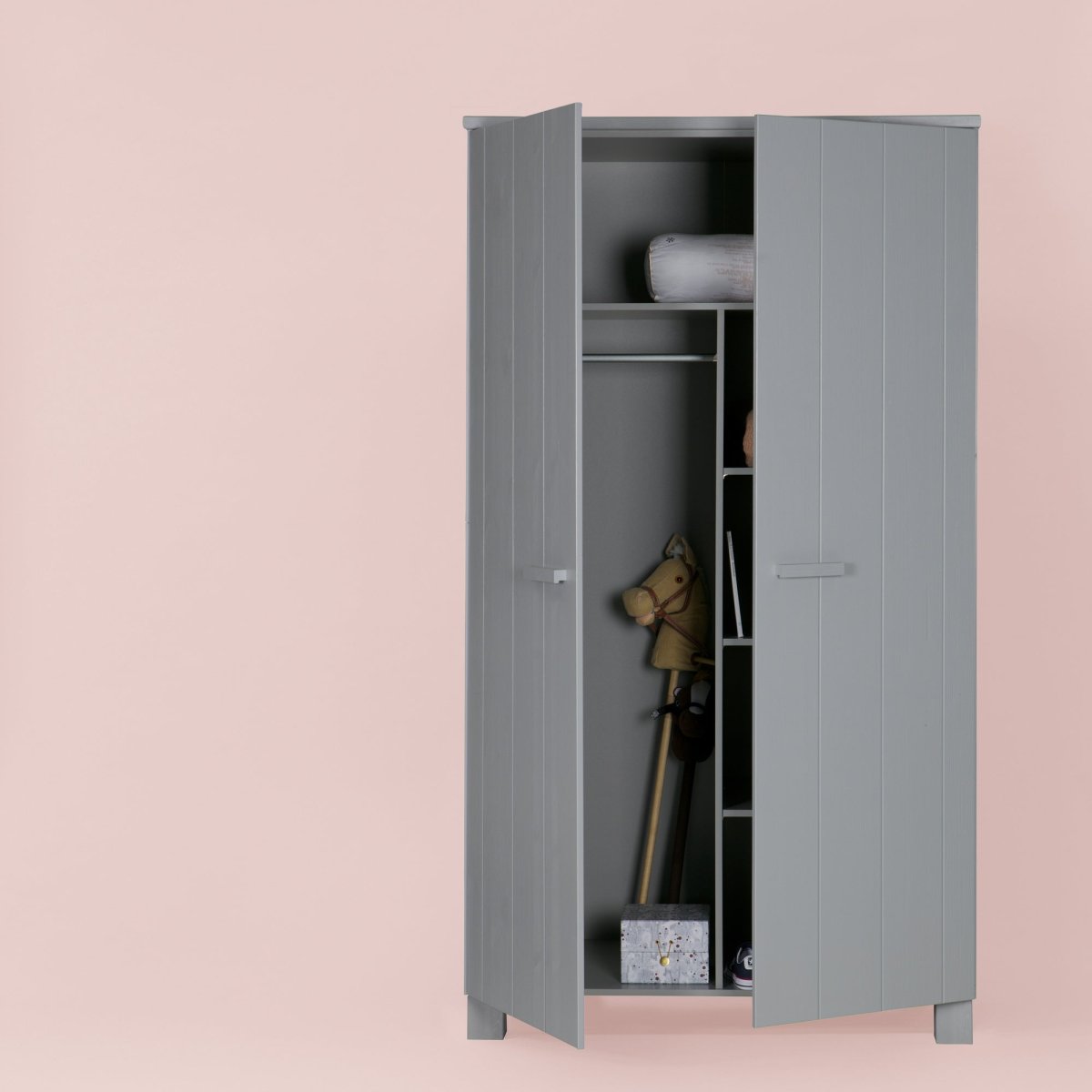Deze robuuste 2-deurskast uit de Dennis collectie van WOOOD straalt stoerheid en duurzaamheid uit. Met zijn geborstelde afwerking en karakteristieke nerftekeningen is het een ware eyecatcher in elke ruimte. Afgewerkt in de kleur Betongrijs. De kast, vervaardigd uit FSC-gecertificeerd grenenhout, biedt met zijn meerdere legplanken voldoende opbergruimte voor al je spullen. Met een hoogte van 202 cm, een breedte van 111 cm en een diepte van 55 cm past deze kast perfect in verschillende interieurs.