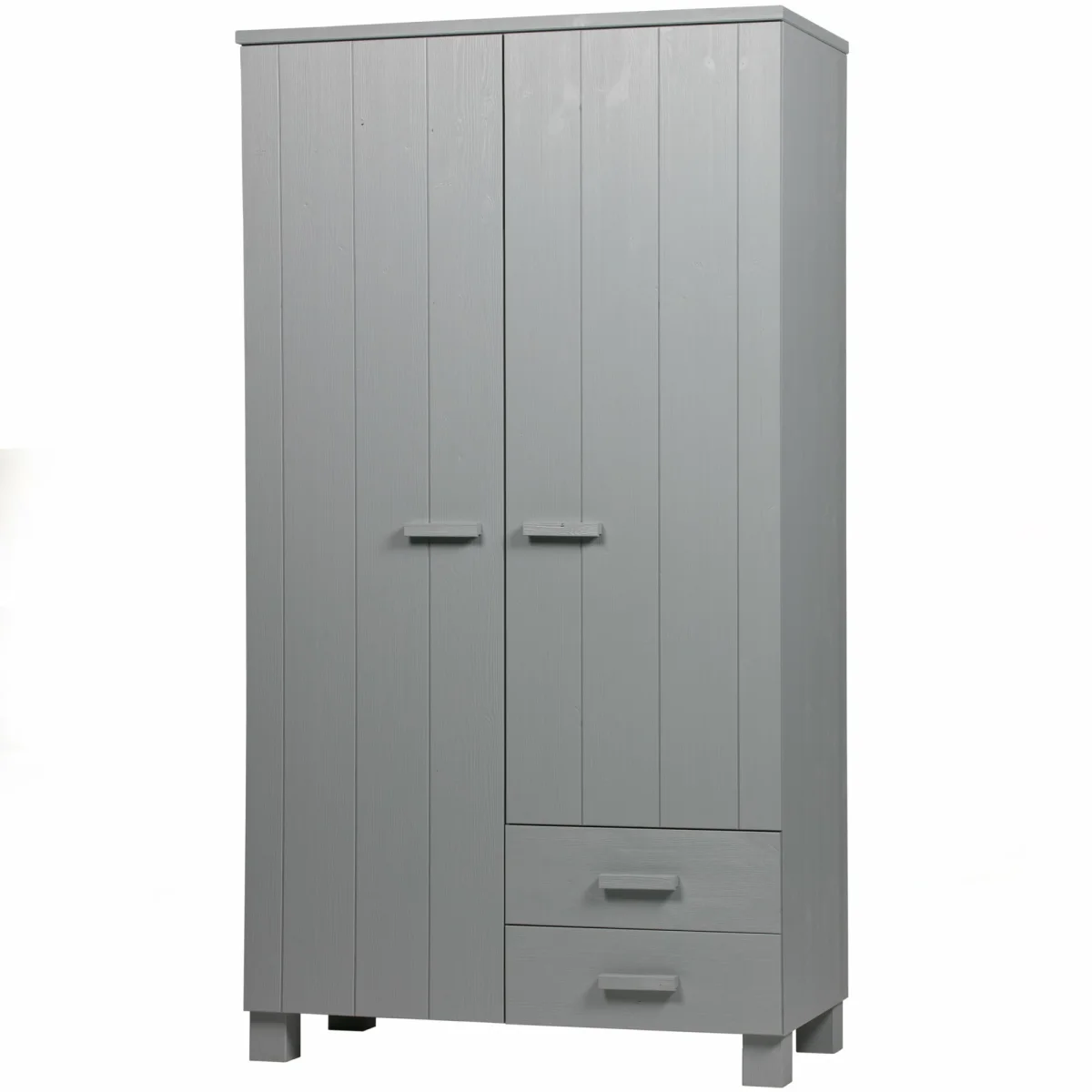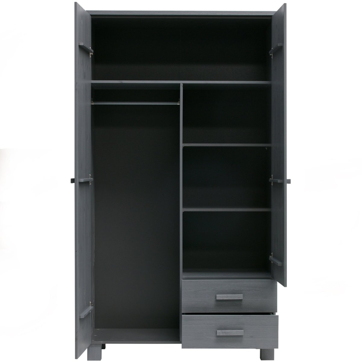 Het interieur van de kast is praktisch ingedeeld met een brede legplank bovenin, een gedeelde roede aan de linkerkant, en aan de rechterkant drie gedeelde legplanken, plus een handig ladeblok met twee lades. Deze veelzijdige kast maakt deel uit van de Dennis-serie, die ook een bedbank, een bureau, een opbergkist, een nachtkastje en een wandplank omvat, waardoor je een complete en stijlvolle kamer kunt creëren.