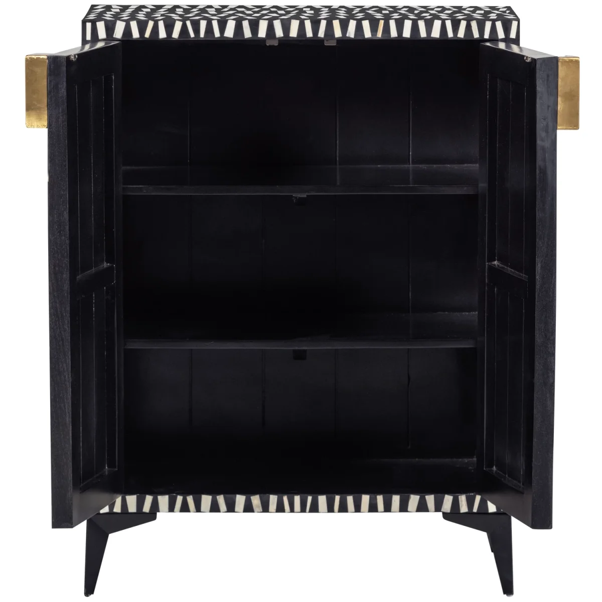 De Menne opbergkast, uit de Exclusive collectie van het Nederlandse interieurmerk WOOOD, is een ware blikvanger in huis en heeft bijzondere features. Zo is het frame van Menne gevormd uit matzwart mangohout en het onderstel van gepoedercoat metaal. Het unieke aan Menne is de buitenzijde met bone inlay, dit duurzaam ingewonnen materiaal is afkomstig vanuit slachtafval om zo dit unieke en opvallende interieurstuk te versieren!