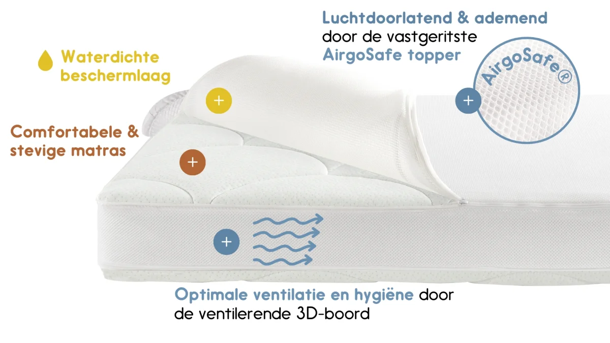 Is jouw baby een buikslaper of een woeler? Geen zorgen! De Airgosafe-topper blijft stevig op zijn plek, zelfs bij de drukste nachtelijke bewegingen. Het ademende ontwerp zorgt voor een constante luchtcirculatie, waardoor het bedje fris, schoon en hygiënisch blijft – nacht na nacht. Dit matras biedt dus niet alleen optimaal comfort, maar ook een gerust hart voor jou als ouder.